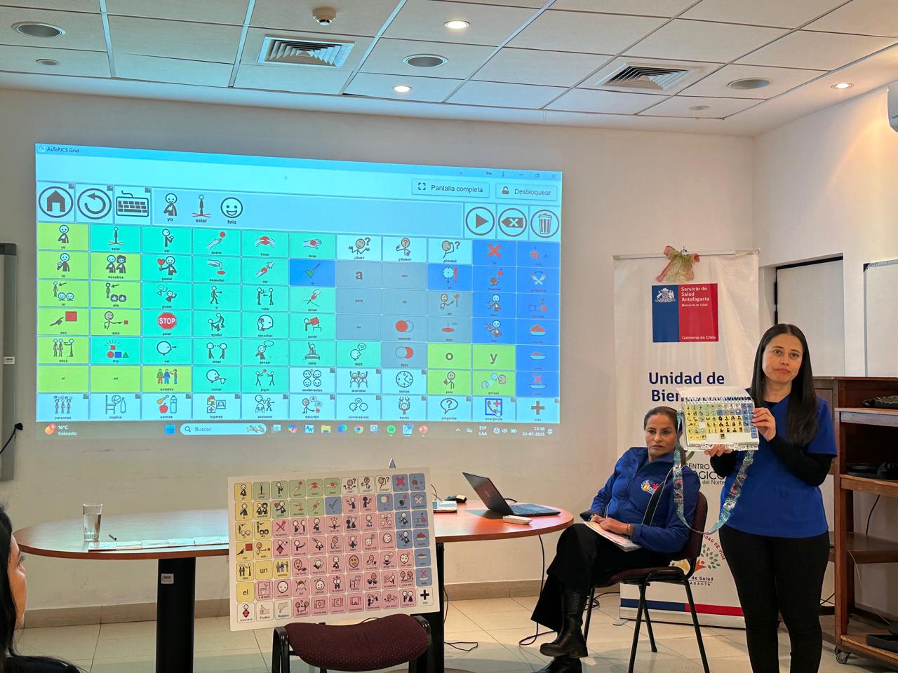 Durante la charla se presentó la comunicación aumentativa alternativa que es una opción para que los niños con mayor complejidad se puedan comunicar con sus padres, mediante tableros con palabras e imágenes, identificando las diferentes necesidades como la comida, sentimientos, juguetes, visitar lugares y cuidados.